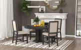 5-piece Dining Table and Chair Set: Round tabletop and four chairs. Two colors are available for you. The wooden dining set combines modern and farmhouse style to create a warm and cozy atmosphere. And the black dining set will add a touch of vintage elegance to your home.